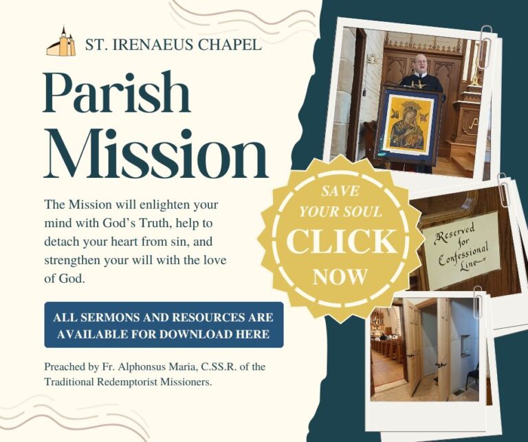 Please check back often and pray for a priest to be assigned to St. Irenaeus Chapel, in God’s good time.